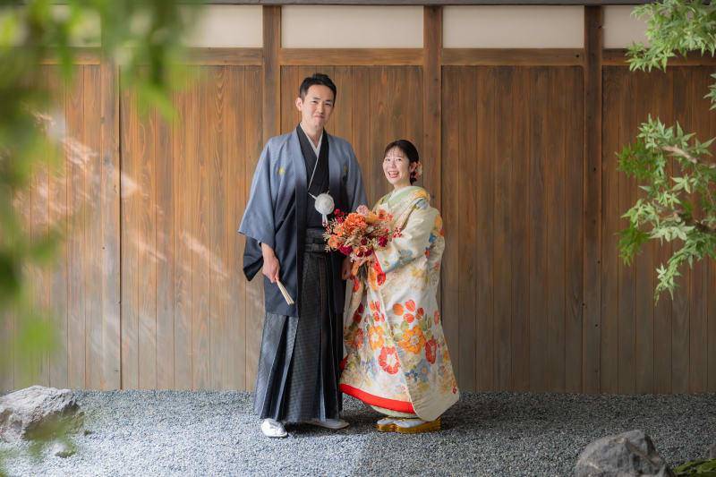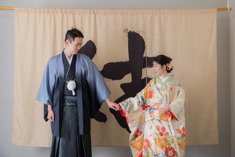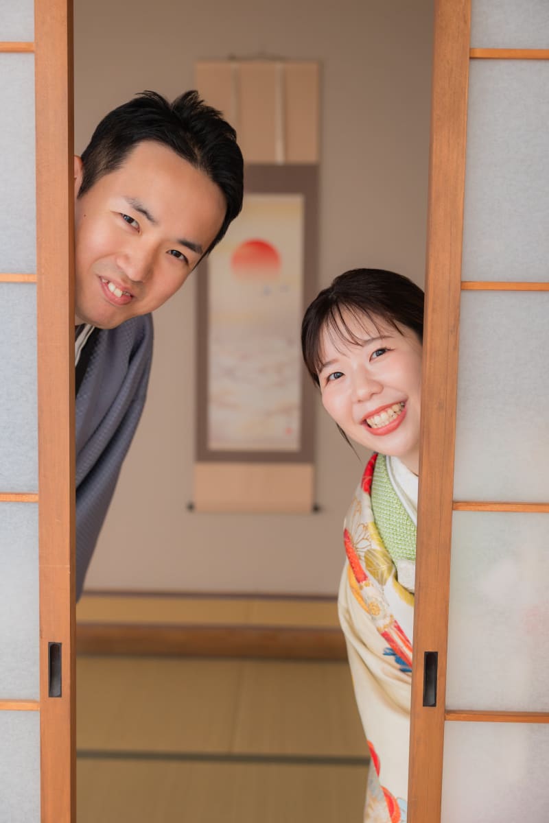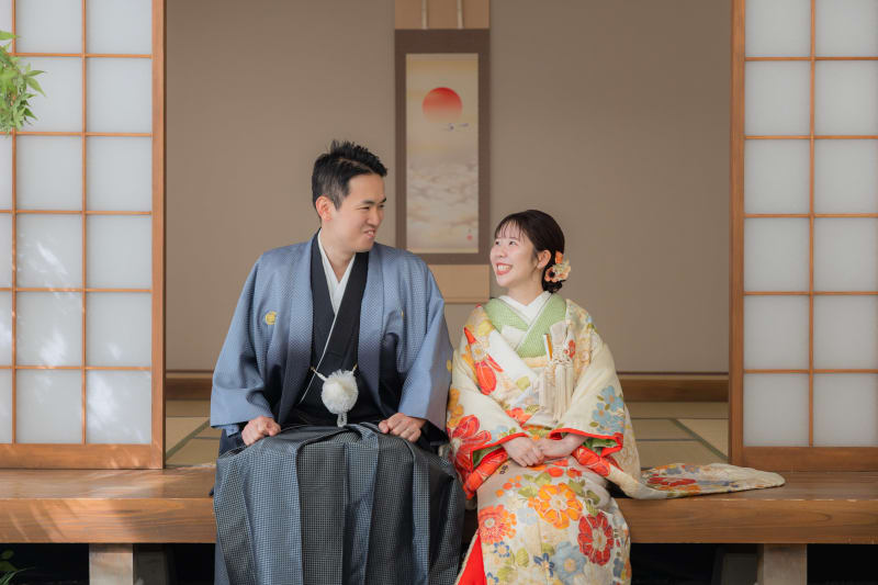 結婚式の招待状やウェルカムボードにも使いやすい正座でのお写真。 お茶室で撮影することでさらに和の雰囲気が増します!