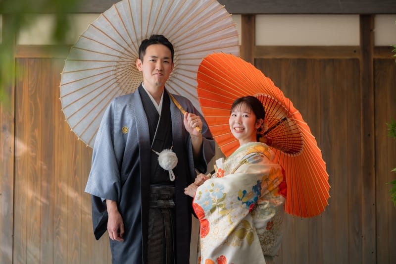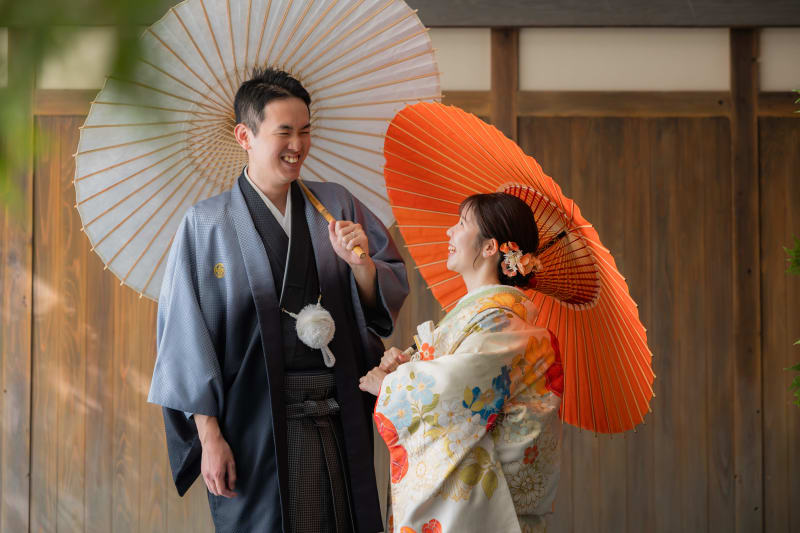 和傘は、無料で貸し出しを行なっております。お二人の写真に是非組み込みましょう。向き合うお二人の、自然な笑顔が素敵な一枚。 お二人らしさあふれるお写真もしっかりと残していきましょう!