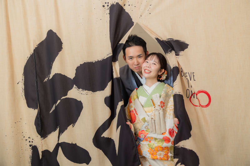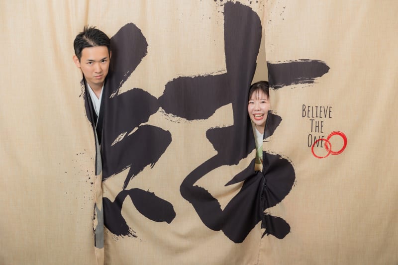 お次は「結」の文字があしらわれたのれんを使って。 顔だけをひょこっと出したポーズがキュートです!ひょっこり出てきていただいた可愛らしい写真