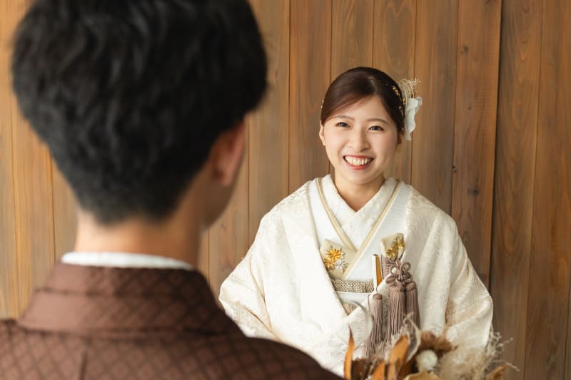 新婦さまは、白無垢にアイボリーやベージュ色の和装小物を合わせております。