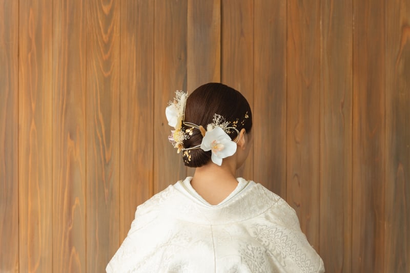 新婦さまの髪飾りも胡蝶蘭をメインにホワイト、アイボリー、ブラウンなど