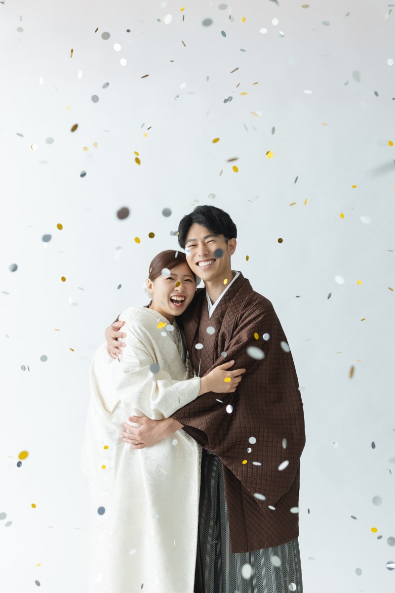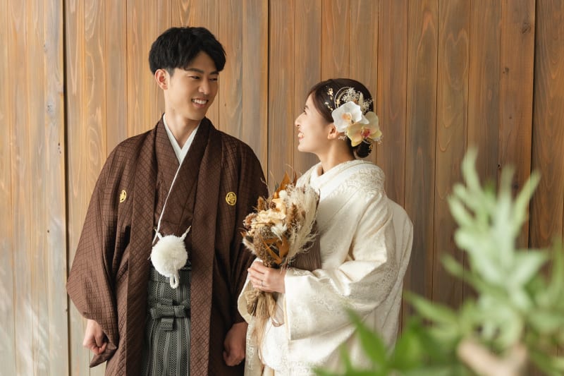 新郎さまは、ブラウンの紋服にグレーの袴合わせ。