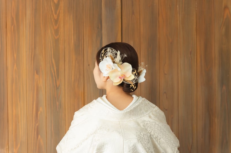 ツルッと綺麗めなシニヨンに大ぶりの胡蝶蘭・水引・金箔で華やかかつ自分らしさを出すことができます!