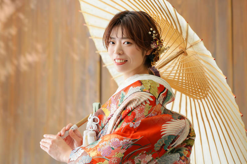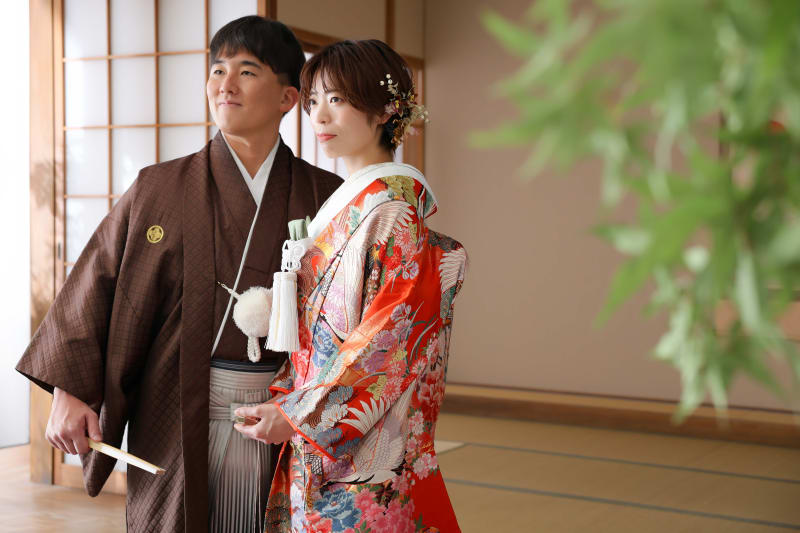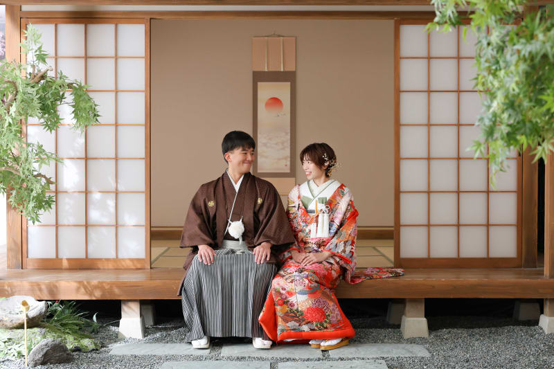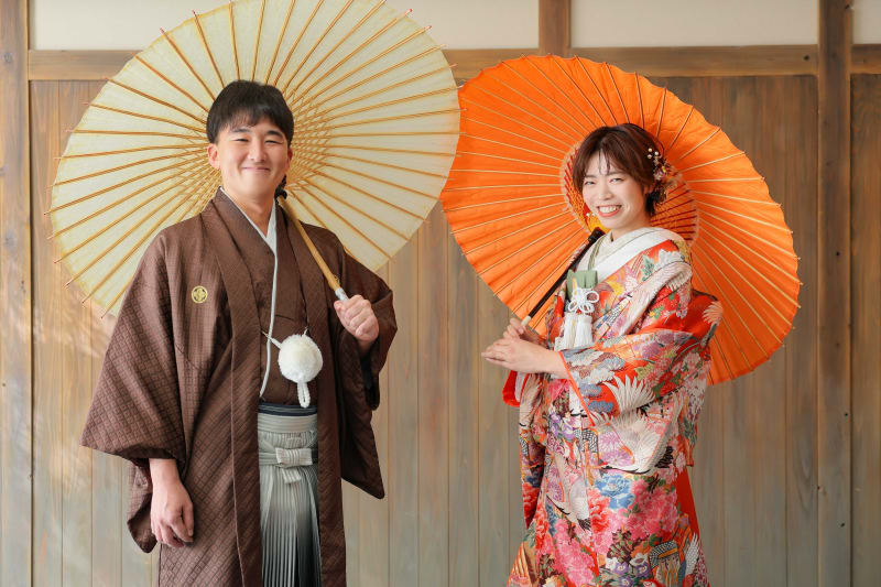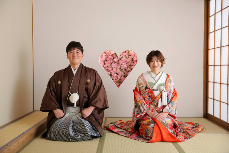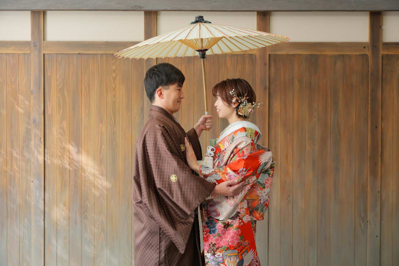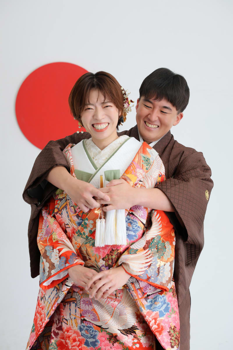 シンプルながらも和風な雰囲気を醸し出してくれる日の丸背景は、お二人の衣装やヘアメイク、表情が主役のお写真を撮るのにもぴったり!
