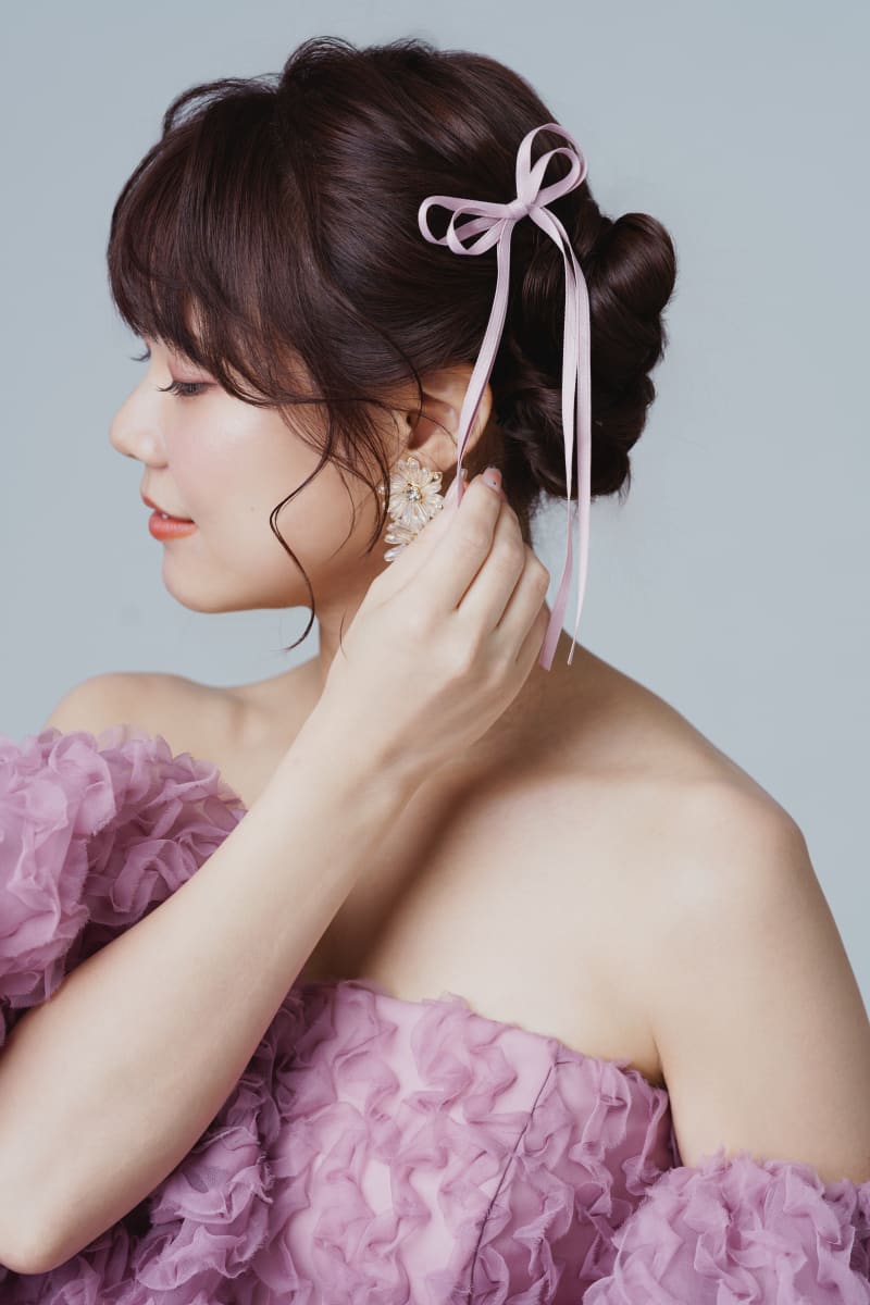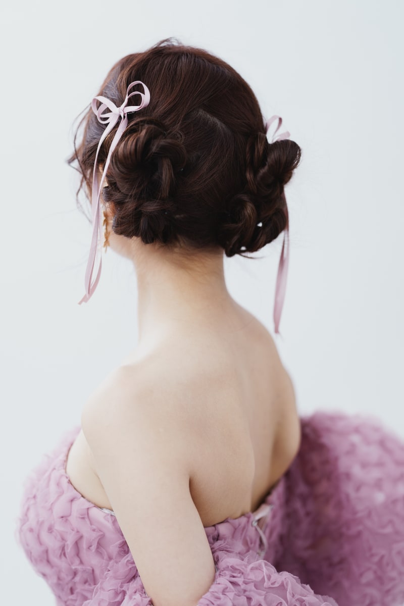 ふわふわの顔周りに、高めのツインスタイル、お持ち込みの細めのリボン