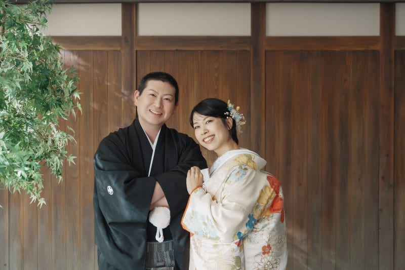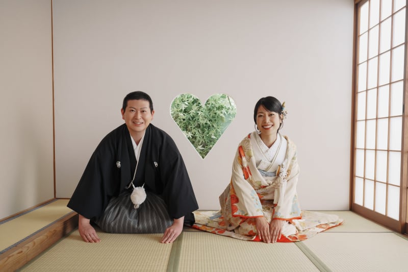 ハートの猪目窓をバックに、フォーマルながらもキュートな印象に ウェルカムボードや年賀状にもピッタリですよ!! 縁側やお茶室、ハートの猪目窓など和の魅力たっぷりの屋内庭園スタジオで、おふたりの素敵な瞬間を残してみませんか?
