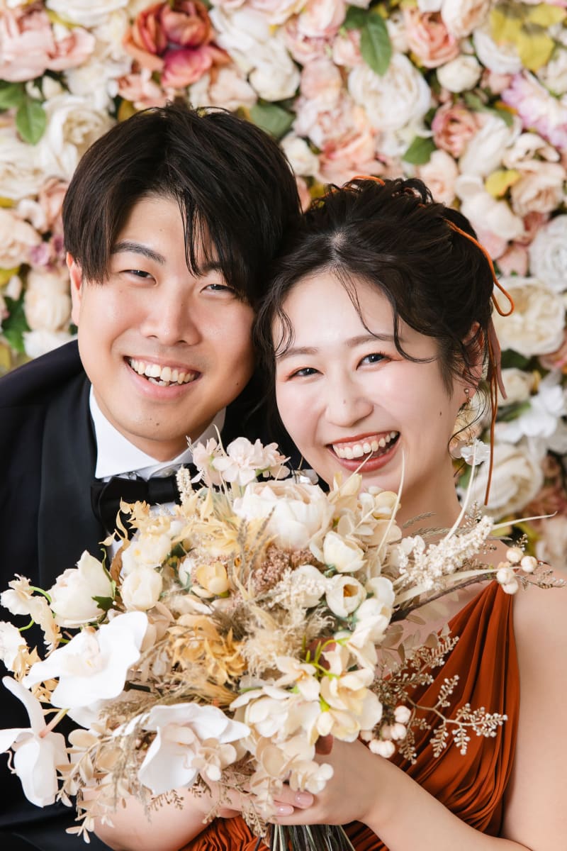 リクエストをいただいたお花の壁で!おふたりの自然な表情が伝わる一枚に。