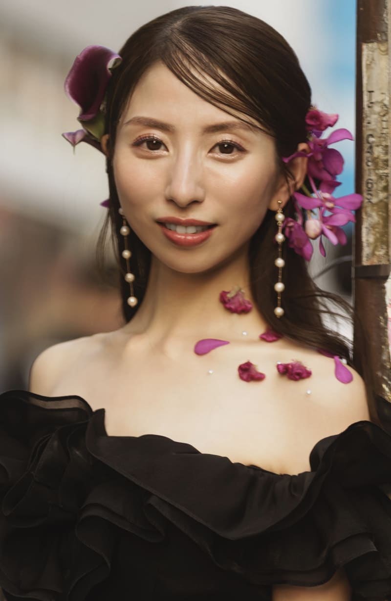 ブラックのカラードレスにピンクの生花で一癖おしゃれに個性的になるように工夫しました**