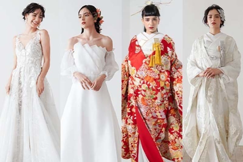 最新のドレスと和装を展示しています。衣装はお写真でもご覧いただけるので是非ご相談ください!