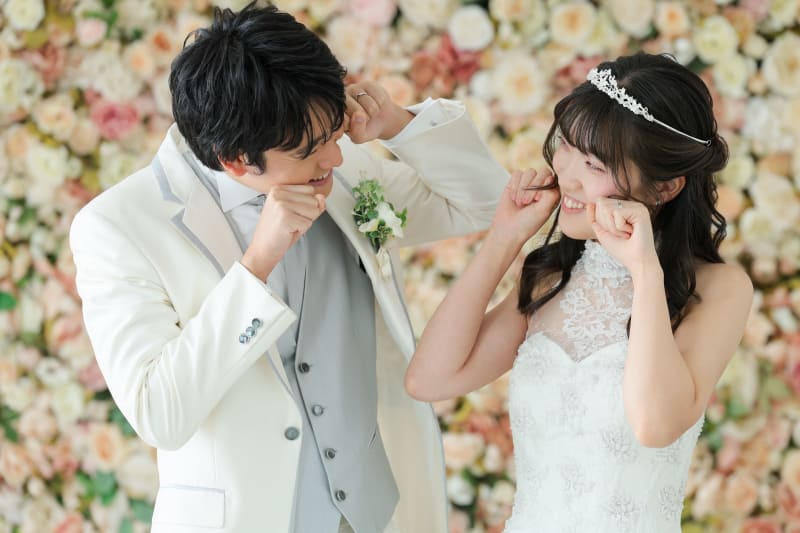 ご新婦様のほっぺをぷにっとつねってイタズラする様子のご新郎様。