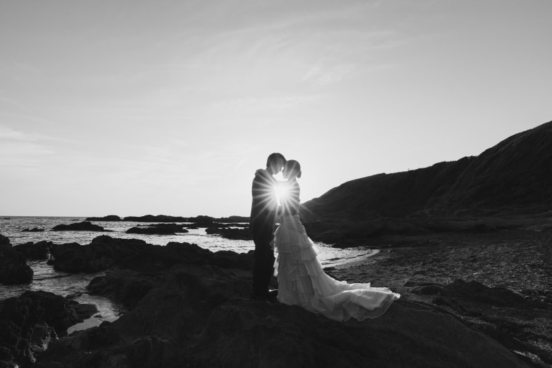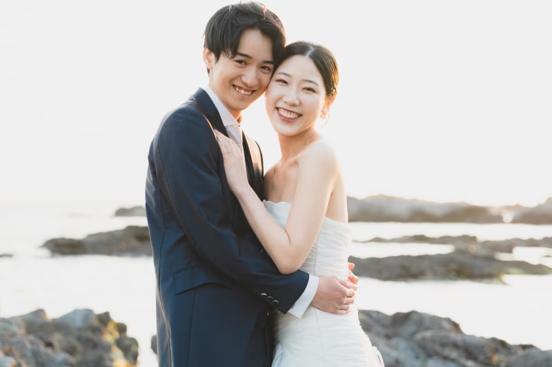夕日の海を背景にツーショット!