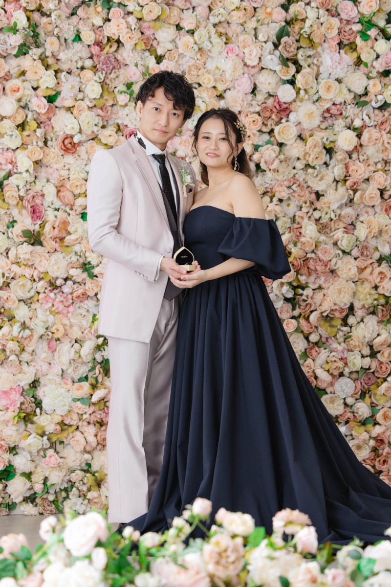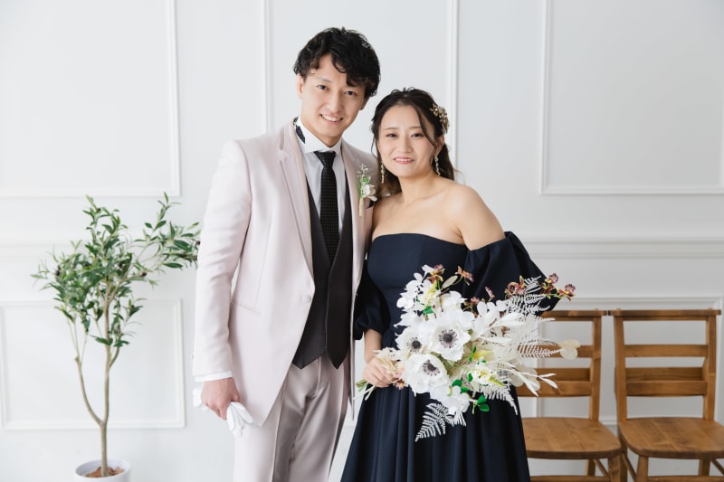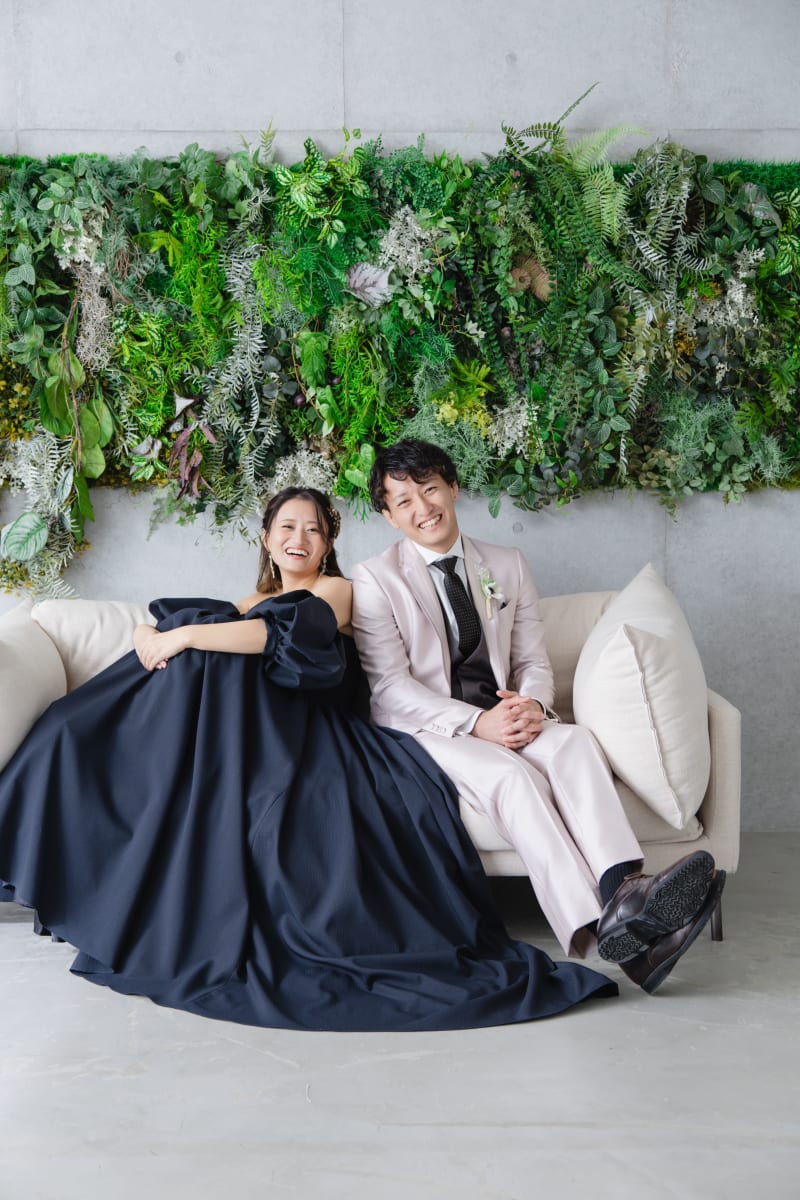 洋装にお着替え!おふたりとも雰囲気がガラッと変わりましたね!背景がシンプルだからこそ、衣装が映えますね!