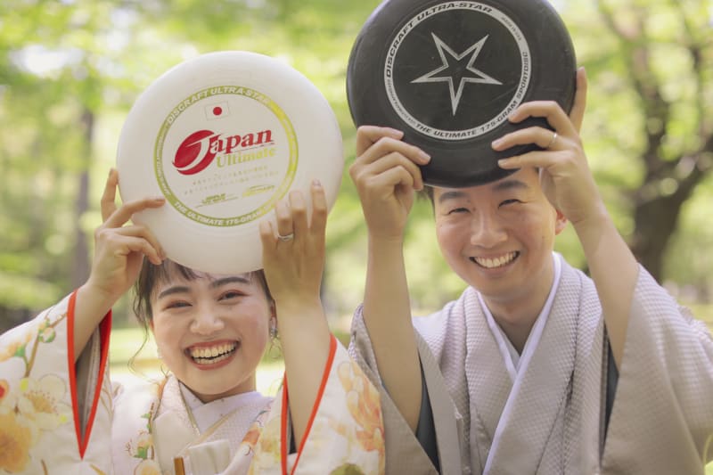フリスビーを持って最高の笑顔のお2人。素敵です!!!
