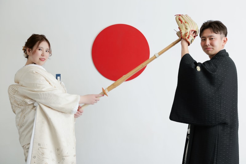 フォトアイテムと一緒におふたりらしさ満載のユニークなお写真を残すのもいいですね◎
