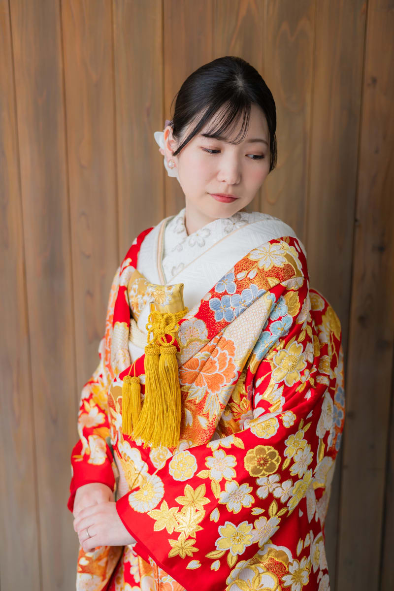 王道の赤の色打掛にゴールドが良く映えるスタイルになっております!
