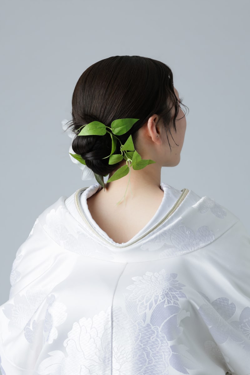 純白の白無垢に鮮やかなグリーンが映えてオシャレな雰囲気に♡