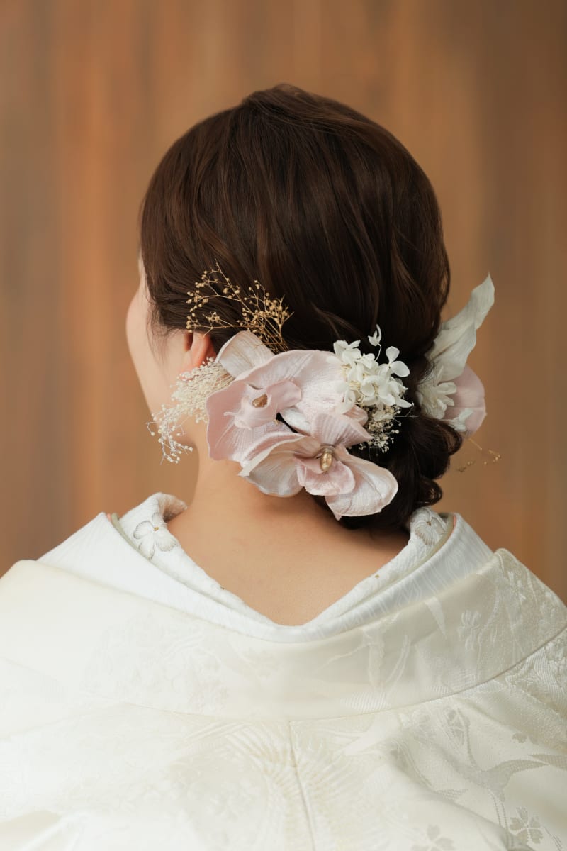 淡いピンク色の胡蝶蘭と白いお花が可愛らしいヘアアレンジ。