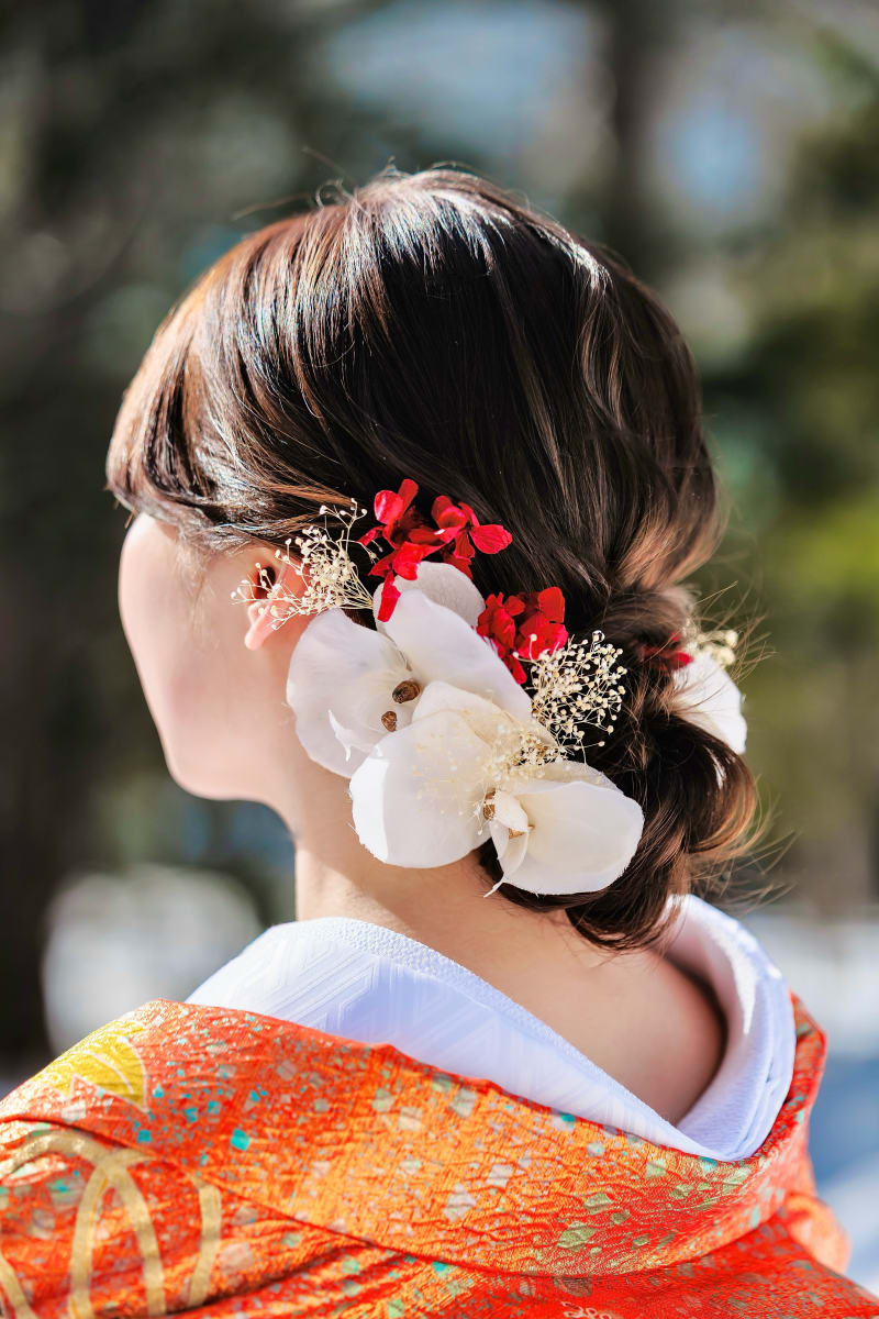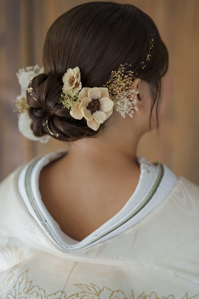 アクセサリーや使用するお花の色合いにより仕上がりのイメージがかわります!
