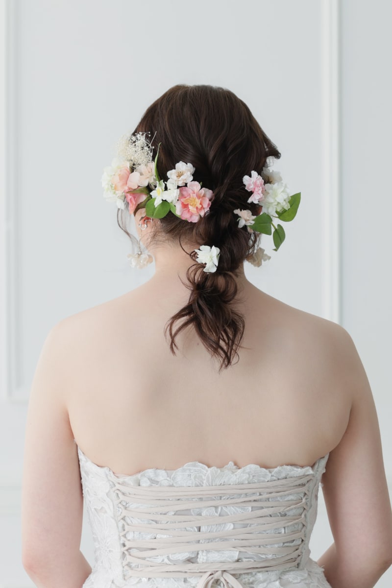 ピンクとホワイトのお花にグリーンが映えるヘアスタイルもお写真に残していきます!