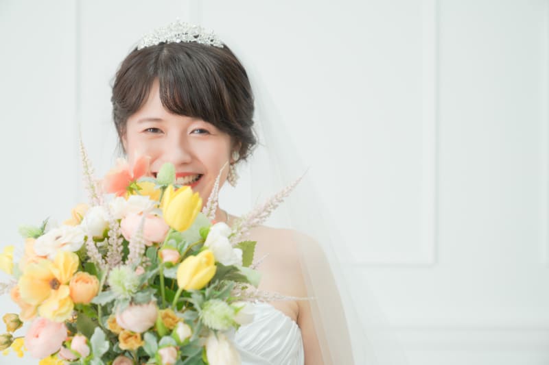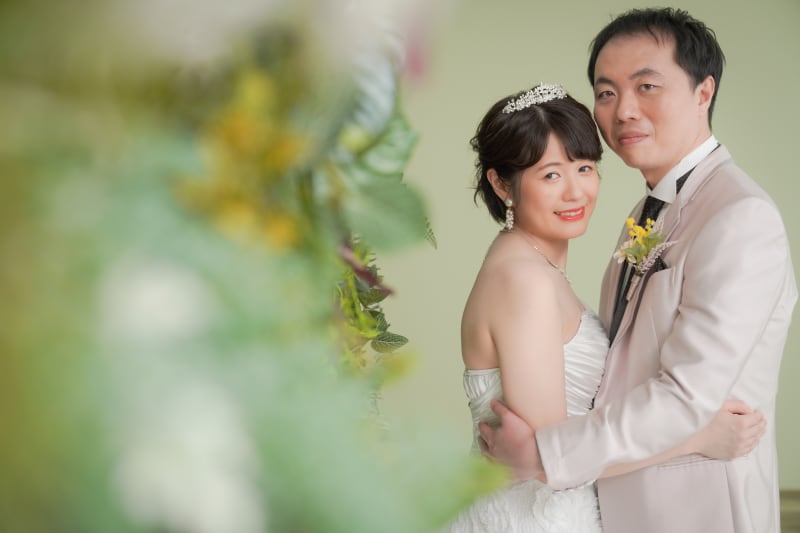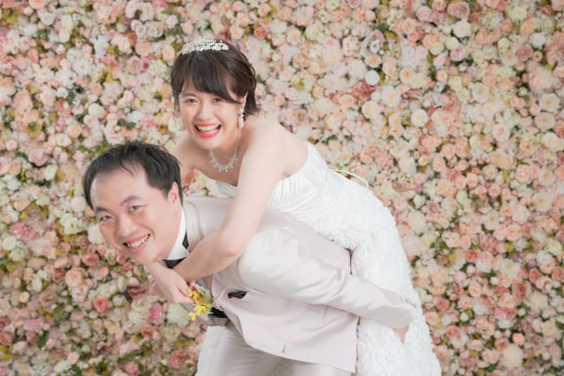 ピンク色のお花の背景は、お二人の表情をより明るく引き立ててくれます!