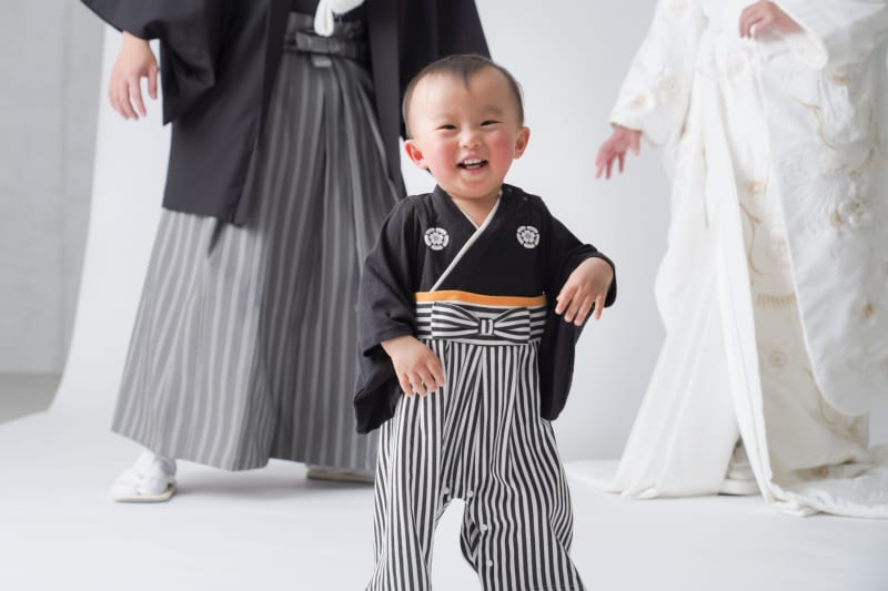 お子様も旦那様と一緒のお着物柄のお洋服をお持ち込みいただき着用しての撮影♪