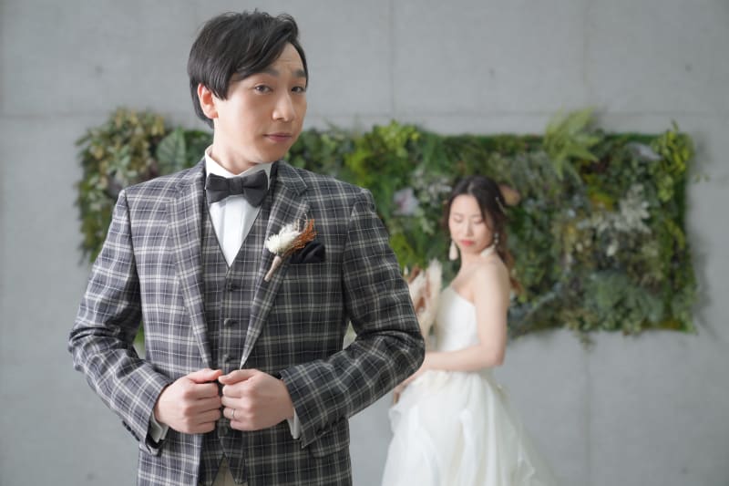 新郎様の個性的なタキシードとキラリと光る指輪がグッと引き締まって見えます。