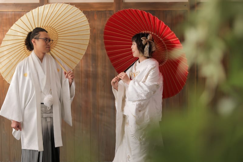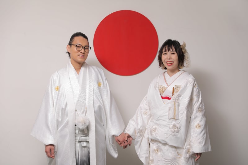 白い背景にお二人の白い衣装、日の丸の赤とご新婦様の衣装の中のワンポイントの赤でとても統一感のあるお写真になりました!!