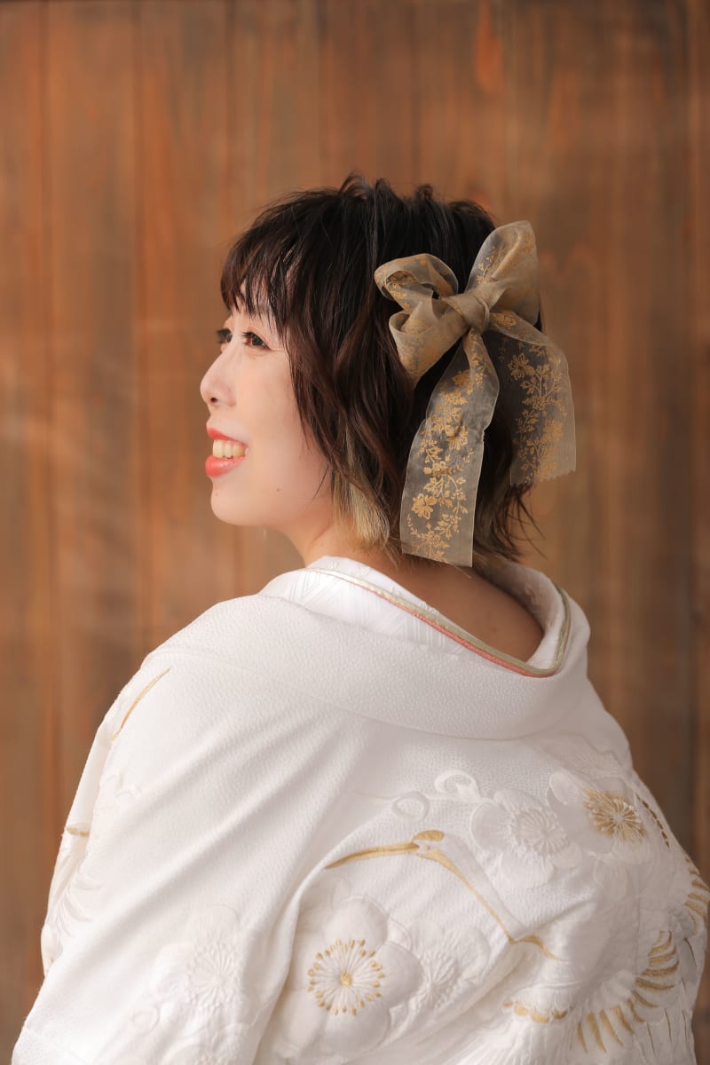 リボンでまとめたヘアスタイルをより強調させたお写真も。
