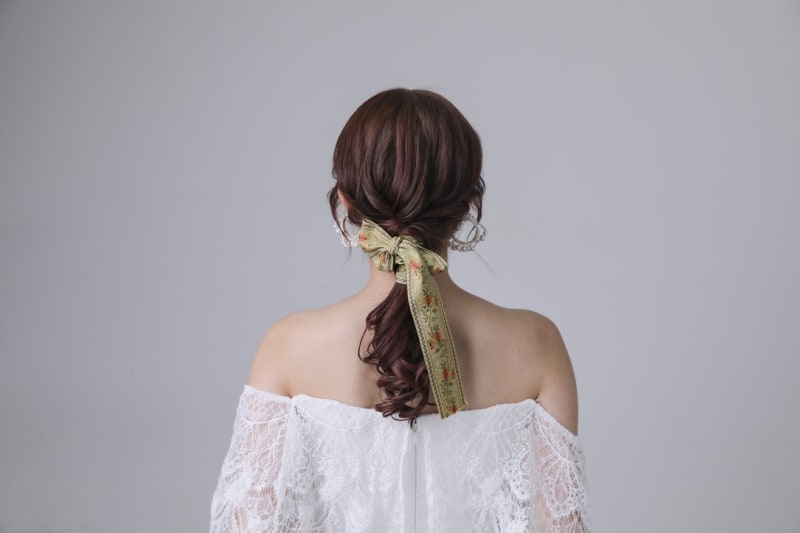 シンプルなローポニーに、柄のあるリボンをプラスしアシンメトリーな長さにすることで個性が出るヘアにしました。