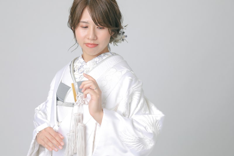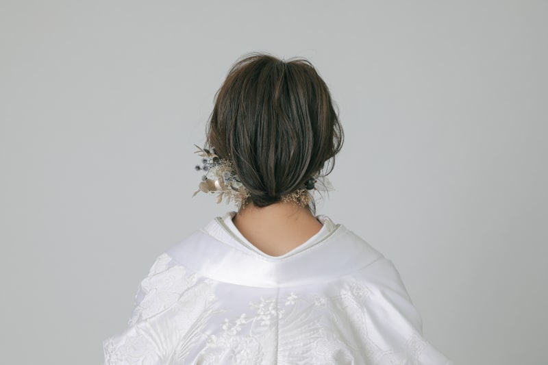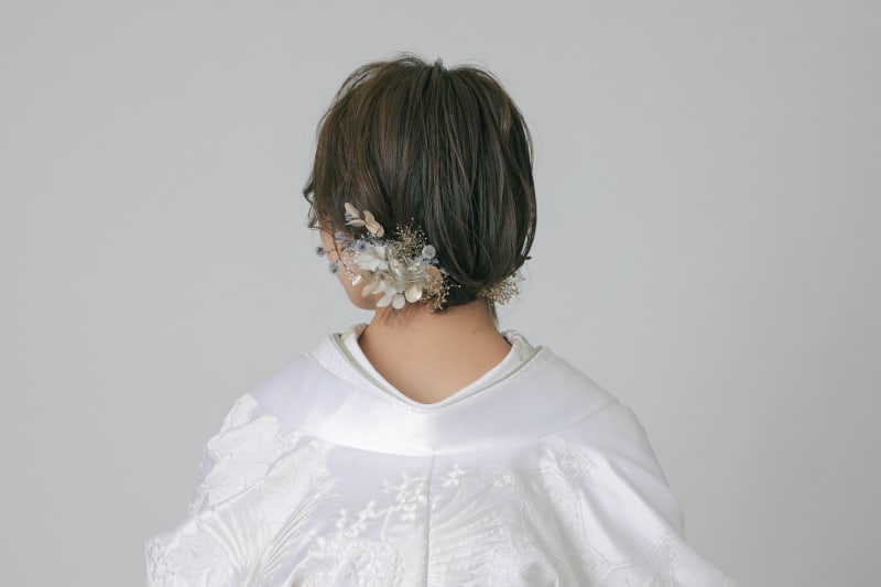 白無垢なので上品さを残しつつ、トップはふわっと動きを入れて柔らかさ入れました。