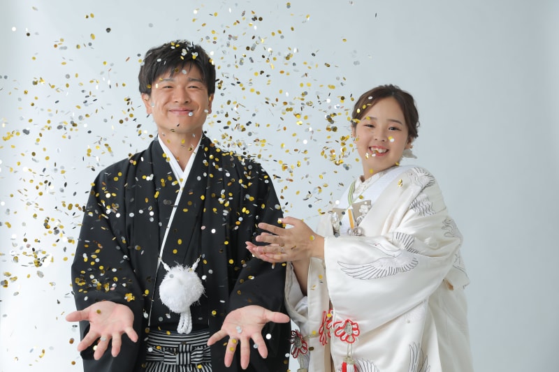 キラキラと輝く紙吹雪に囲まれたお二人の素敵な笑顔がとても印象的な撮影でした!