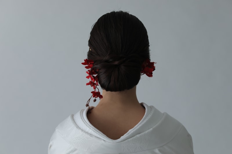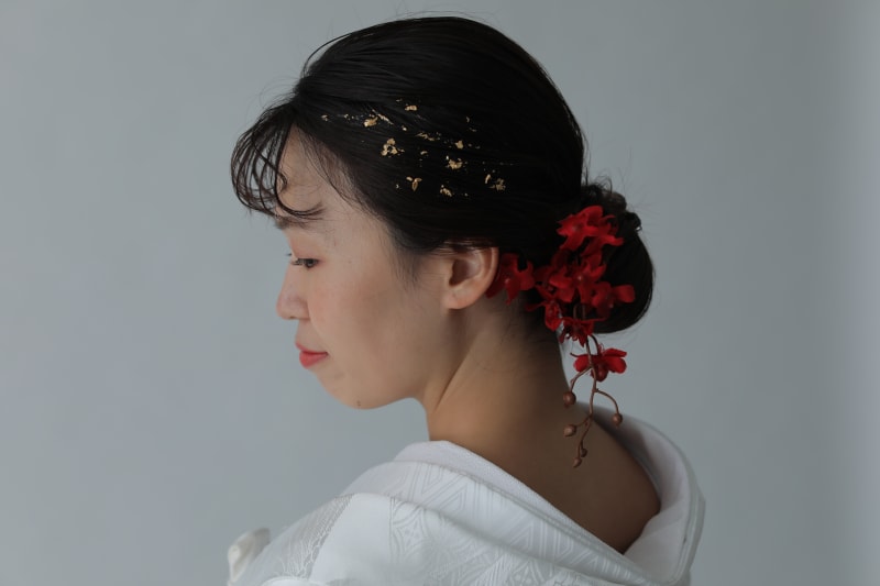 お花をたらしてつける+サイドに金箔をプラスすることで、シンプルだけどおしゃれな雰囲気に!