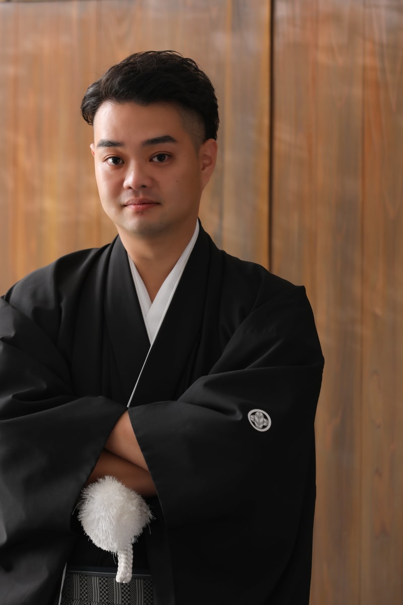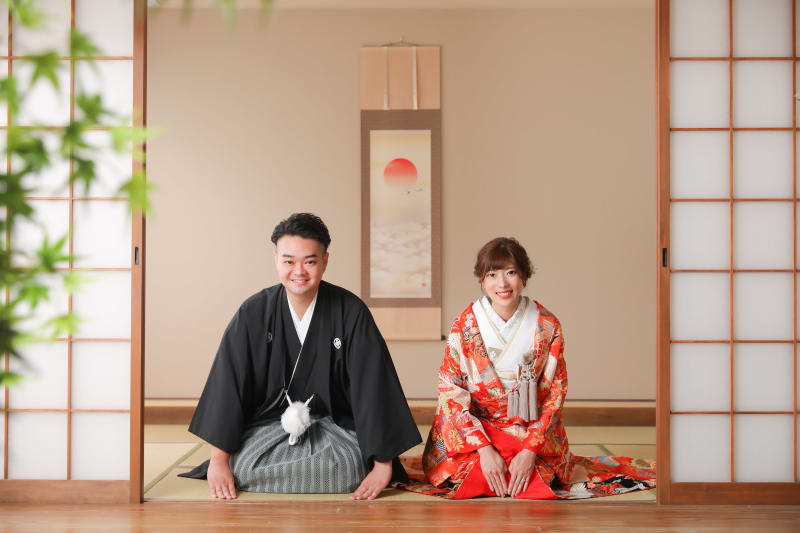 掛け軸を背景に正座のカットも!