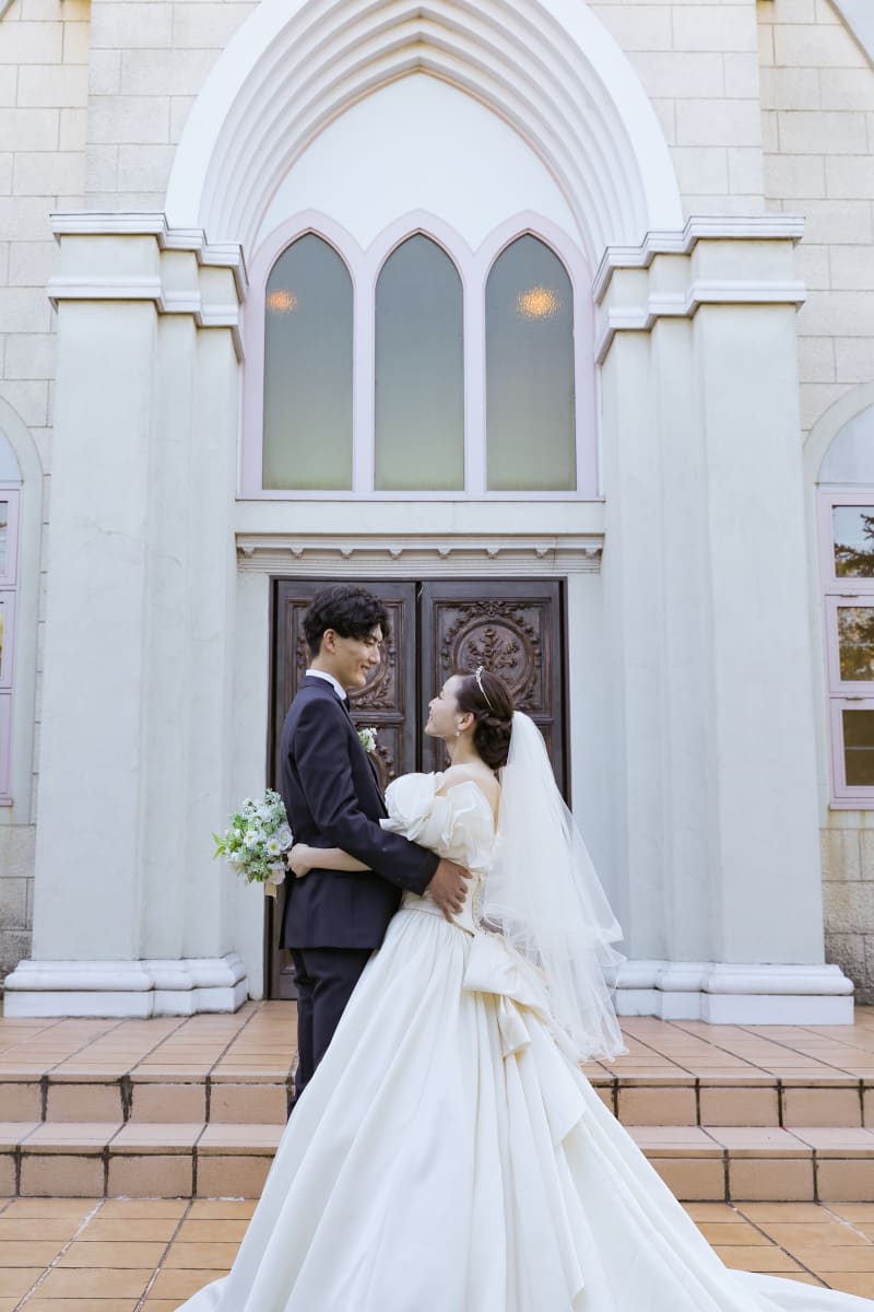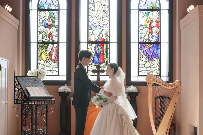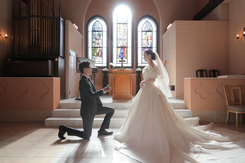 ステンドガラスの前でかっちりショットや指輪のお渡しのシチュエーション✨
