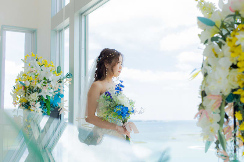 海の色とぴったりのブルーのドライフラワーとブルーのブーケ!