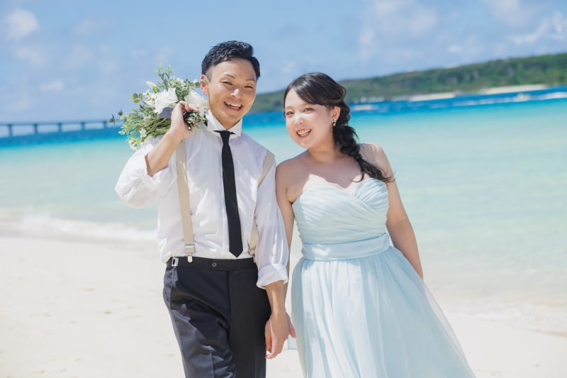 宮古島の海の色と同じくらい綺麗なライトブルーのドレスをお召しいただいております。