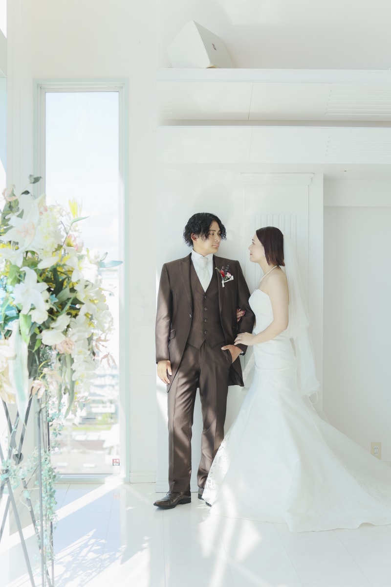 ブラウンタキシード×マーメイドラインウェディングドレス