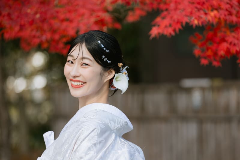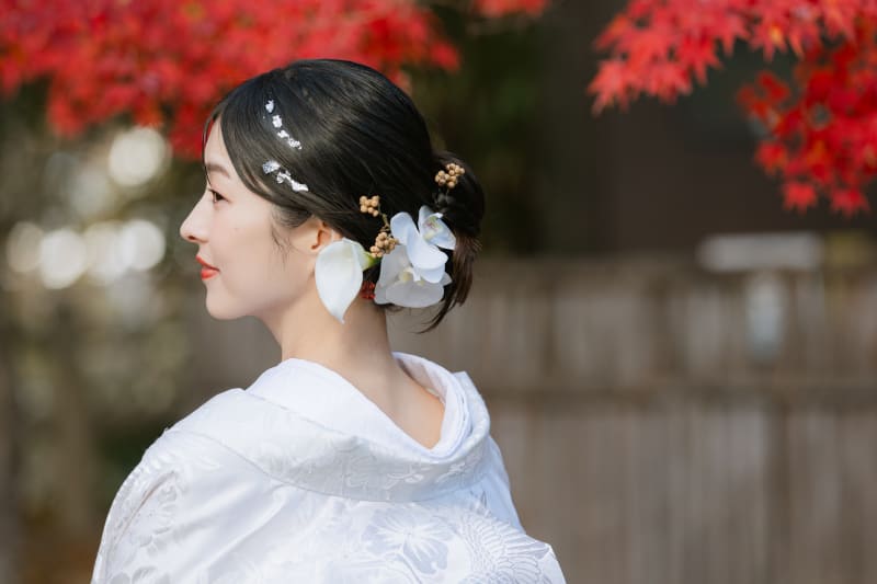 サイドに銀箔をつけて華やかに、アクセサリーはカラーというお花をお持ち込みしてくださいました。