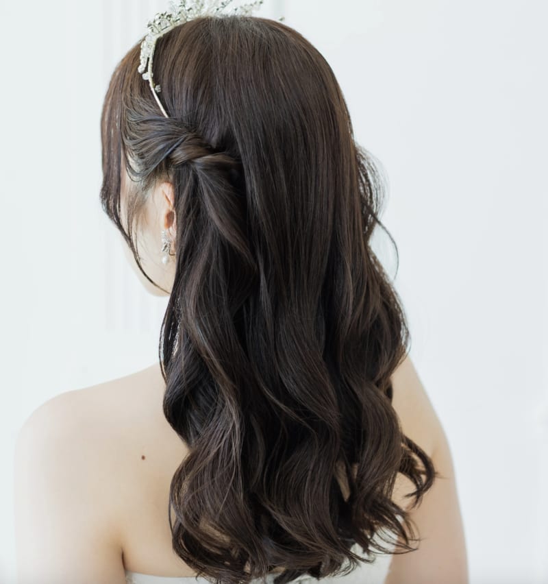 華やかなドレスに合わせて、シンプルで少し韓国っぽい髪飾りの配置に仕上げました☺︎
