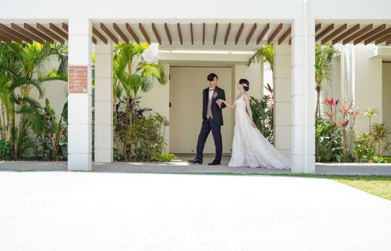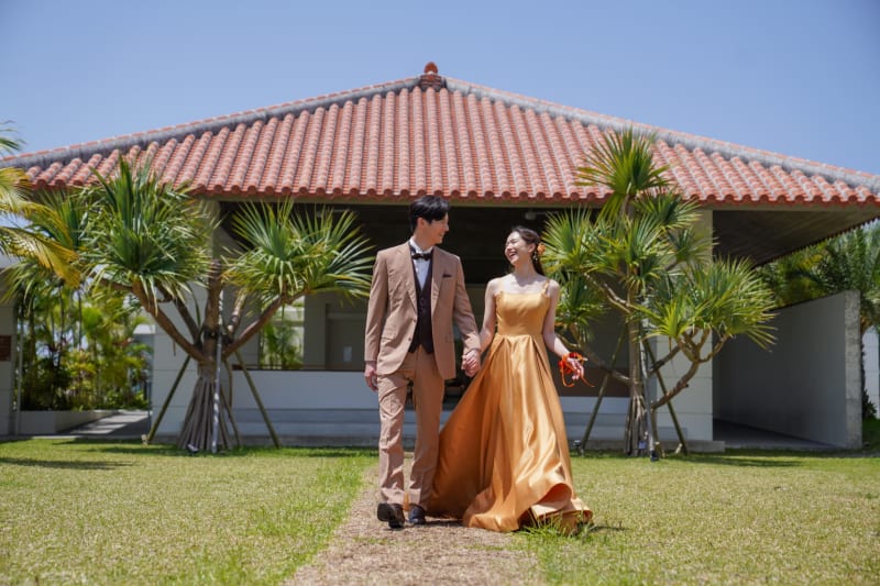 チャペル撮影後はカラードレスに着替えて敷地内でも☆*:.。 敷地内には中庭があったり、赤瓦のエントランスで沖縄らしさも演出できます!