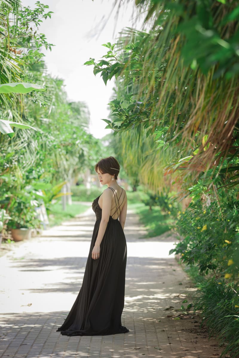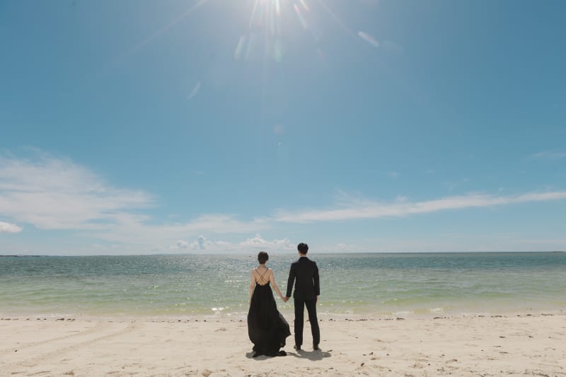 青い海と白い砂浜がブラックドレスをより引き立ててくれます。