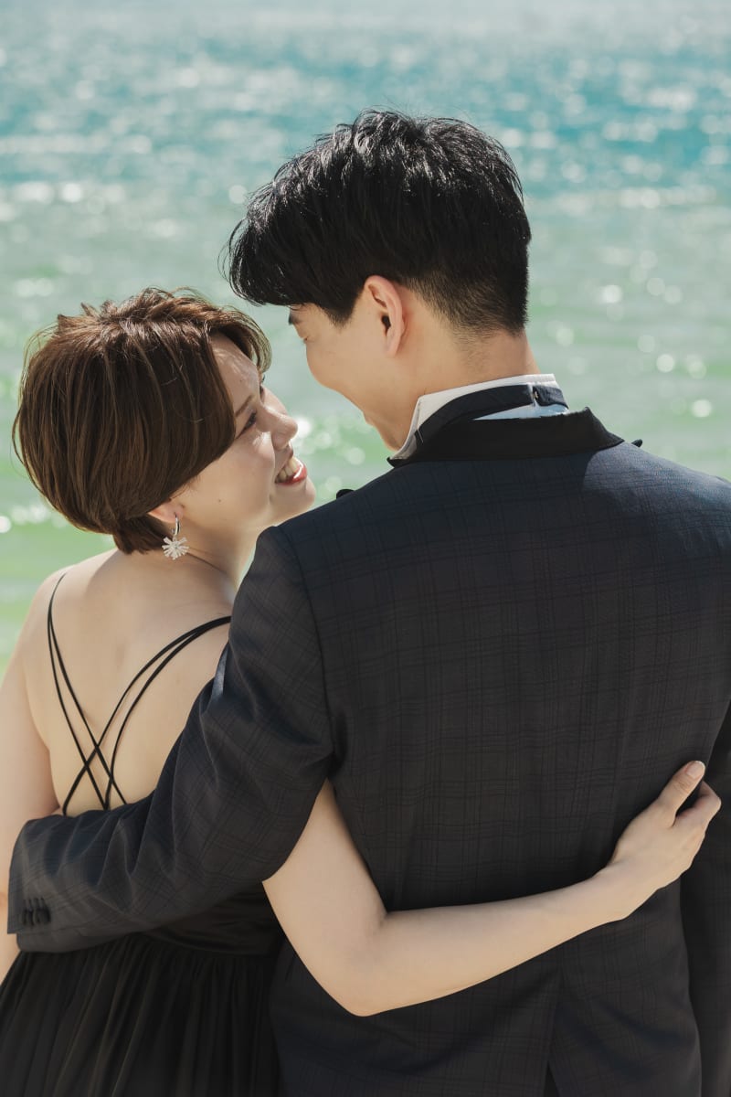 ブラックドレスはシックなお写真だけでなく、優しい雰囲気でも残していただけます。お二人の表情から幸せな雰囲気を感じますね。背景の海もキラキラで綺麗です。