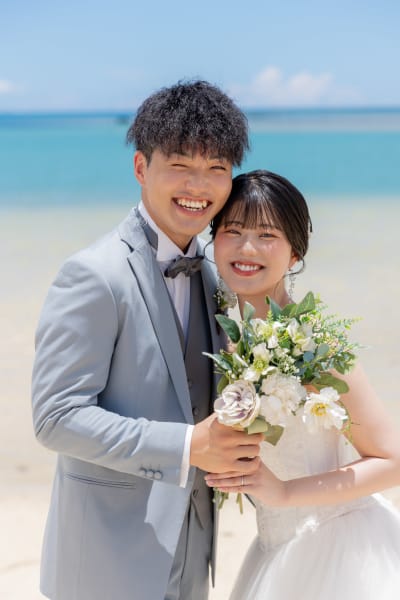 まず、1箇所目のビーチ撮影ではウェディングドレスで王道に。