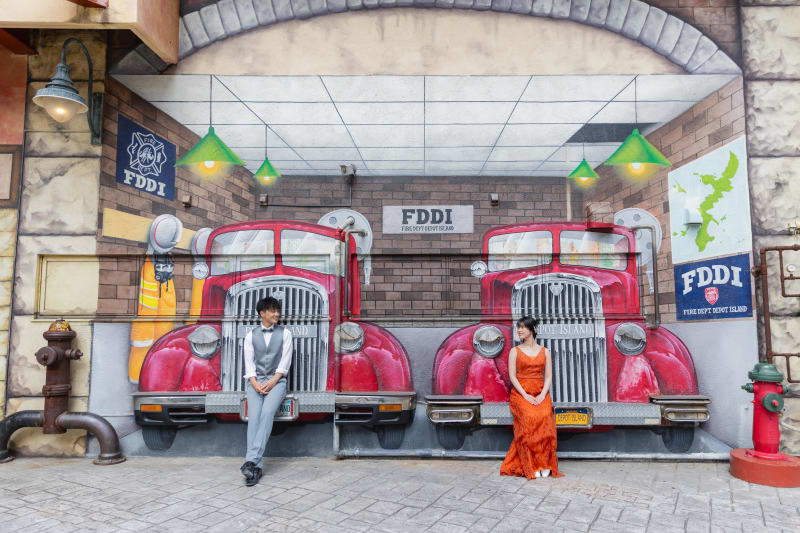 アメリカンビレッジはおしゃれな背景が多いため、カラードレスがよりはえます!