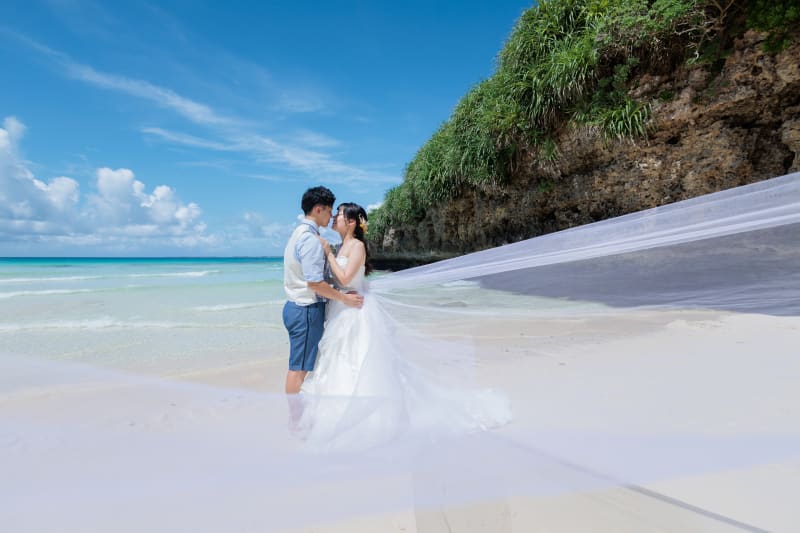 海風でベールがふわりと舞い上がる瞬間、 まるで空と海が祝福しているようです。素敵すぎます!