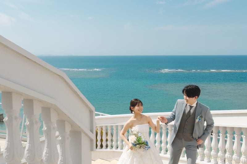 屋上でのカットはお天気がいいととても眩しいですが、沖縄の綺麗な海を入れて撮影できます。