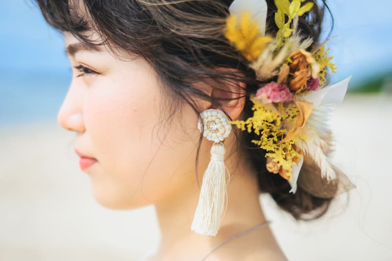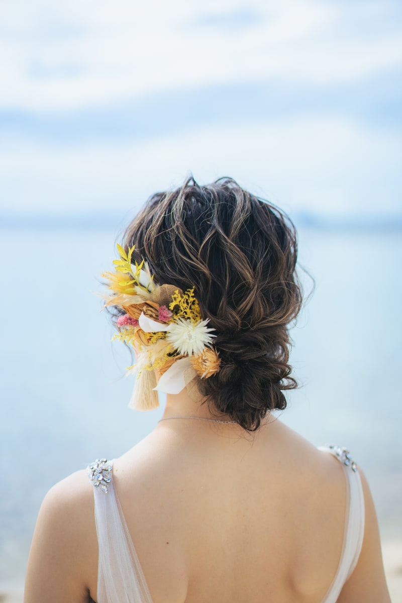 ドライフラワーのヘッドパーツは イエローベースにピンクをポイントに配置にしました♡