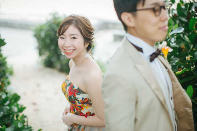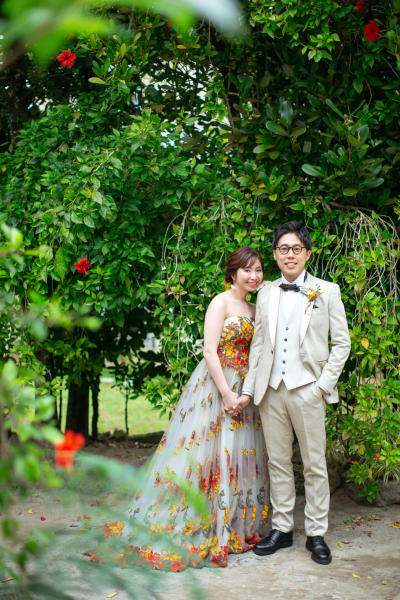 緑が綺麗なフクギ並木で鮮やかなカラードレスがぴったりでした♪