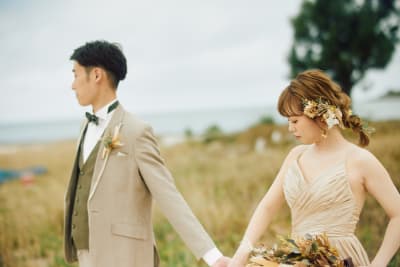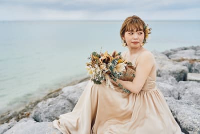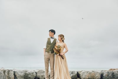 先日撮影しましたお客様のご紹介です♪ ビーチ撮影ではベージュのカラードレスにチャンジ!!