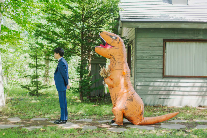 こちらのお写真は、ファーストミートでご新婦様が恐竜の着ぐるみを着て、ご新郎様にドッキリをする様子!